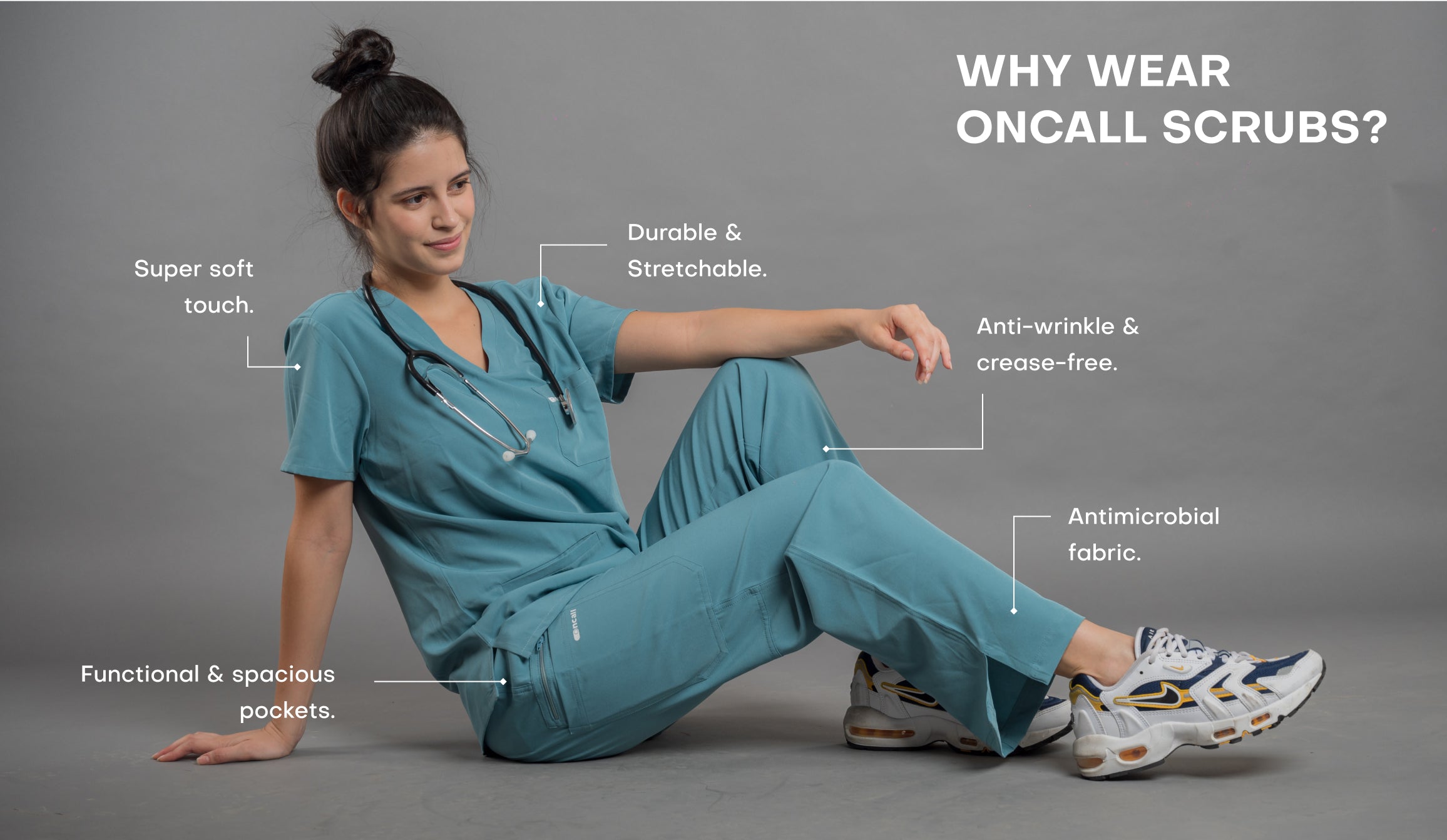 Oncall scrubs are made using premium grade polyester fabrics. They’re breathable, lightweight, dry fast, wrinkle resistant, stretchable – just like your sportswear. ( let’s be honest – medicine is an adventure sport ! )